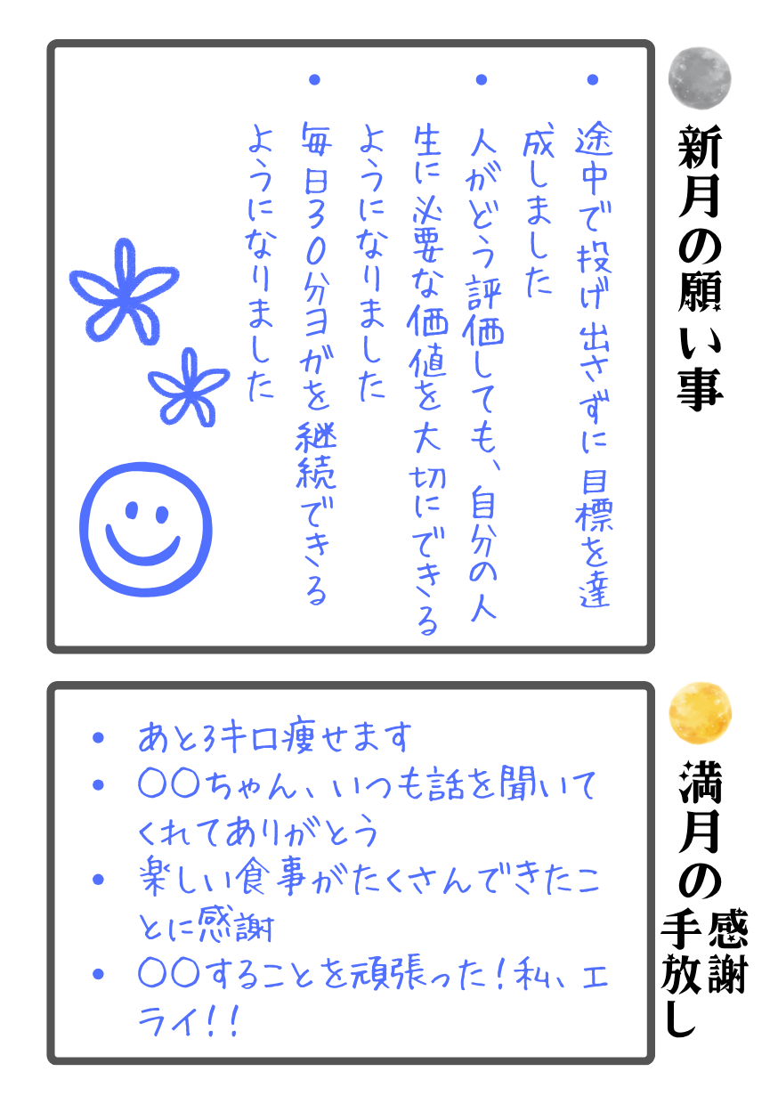 新月の時間を過ぎたら、願い事を書きましょう。イラストを描いても素敵だな🌟と思います。書き方についてはインスタの方に載せていますので参考にしてみてください。