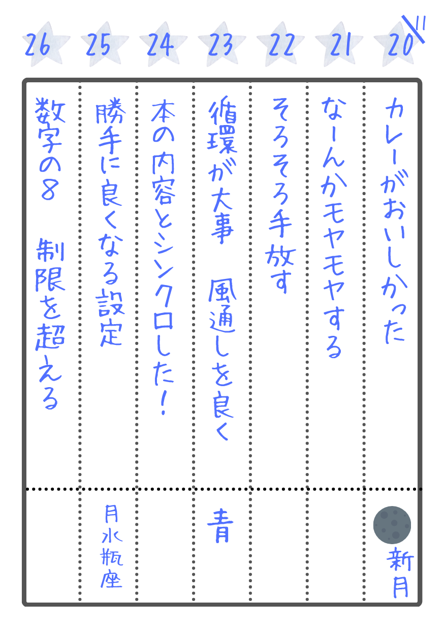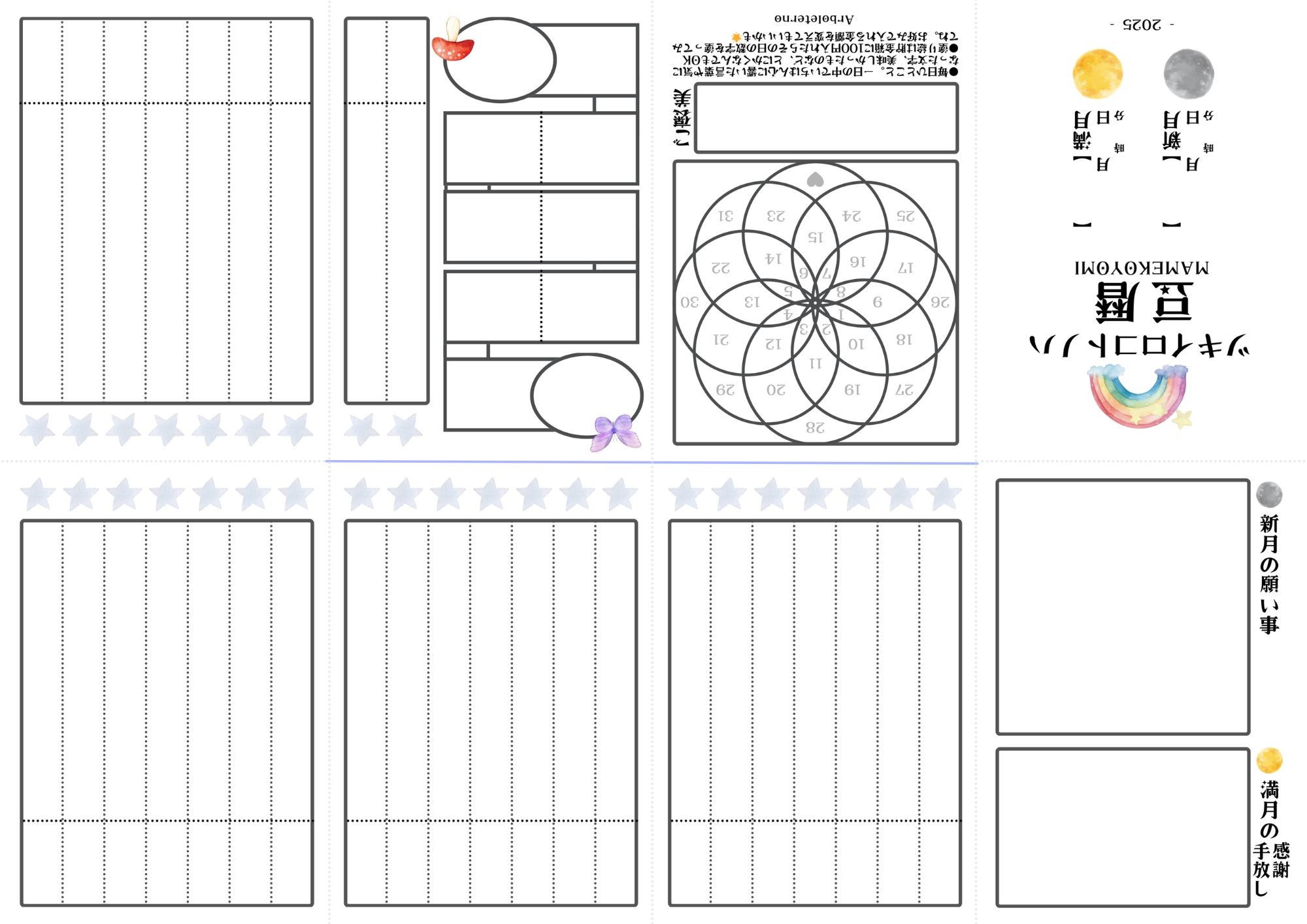 1.新月と満月の情報や日付、すごろくマップ(ジャーニーマップ)、ご褒美などを書きます。