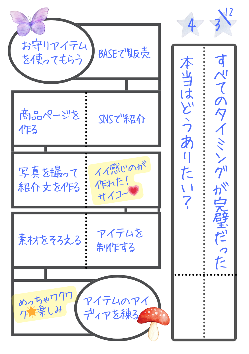 ◆蝶のマスに「未来/叶えたいこと」、キノコのマスび「現状」として達成までのプロセスを書いて“すごろくマップ”を作ってみる。途中に感情などを(想像で)入れておくとよりイメージがリアルになって引き寄せ効果UP✨