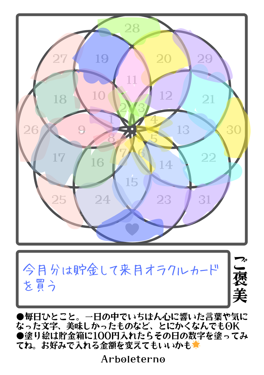 その日の数字のところを好きな色で塗りましょう。”塗ったら貯金箱にお好きな金額を入れる”とするとコツコツ貯金ができます